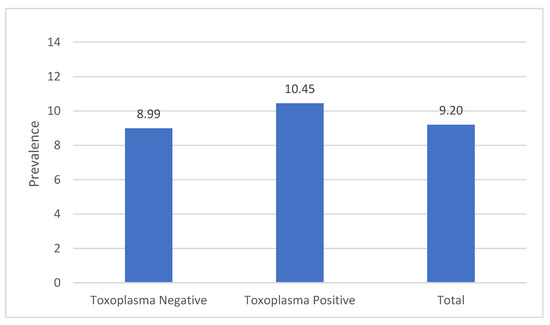 The susceptibility to infection and pathogenicity of T. gondii depends on the strain, immune system status, and genetic factors. T. gondii strains have several genotype groups, including type I, II, and III, which are different in geographical distribution and virulency, with strain type II being the most common strain in North America [9]. Regardless of the strain group, the human immune system usually prevents toxoplasmosis pathogenicity with the exception of pregnant women and immunocompromised individuals. When pregnant women get infected with the parasite, the tachyzoites may cross the placenta and infect the developing fetus causing diseases, growth failure, or abnormalities [10]. Furthermore, the pathogenicity of toxoplasmosis is linked to an increase in oxidative stress and inflammation; thus, it is associated with various diseases such as heart diseases, obsessive-compulsive disorder, and schizophrenia [11,12,13]. Moreover, Babekir et al. [14] indicated that T. gondii seropositivity is associated with elevated levels of biomarkers and clinical markers such as triglycerides (TG), systolic blood pressure (SBP), low-density lipoprotein cholesterol (LDL), gamma-glutamyl transferase (GGT), and C-reactive protein (CRP).