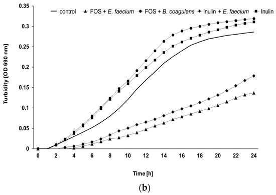 Two commercially available prebiotic products were used in this study. Inulin derived from chicory (90%; DP 2-60; Orafti®GR, Beneo GmbH, Oreye, Belgium) and fructooligosaccharides (FOS) produced by partial enzymatic hydrolysis from chicory inulin (93–97% β-(2,1)-linkage oligofructose; DP 2-8; Orafti®P95, Beneo GmbH, Oreye, Belgium) were diluted in PBS to a concentration of 20 mg/mL and sterile-filtered (0.2 µm cellulose acetate; VWR international, Radnor, PA, USA). Enterococcus faecium DSM 7134 (1010 cfu/g, Bonvital Pellets, Lactosan GmbH & Co.KG, Kapfenberg, Germany) and Bacillus coagulans DSM 32016 (2.5 × 109 cfu/g, TechnoSpore®, Biochem, Lohne, Germany) served as probiotic products. Both probiotics are licensed in the EU as gut flora stabilizers in chickens according to council regulation (EC) No. 1831/2003. The final concentration on microplates was 2 mg/mL for prebiotic products and 107 cfu/mL for probiotic products. The final antibiotic mixture (see Section 2.4) was also tested on the probiotic products to guarantee the absence of growth of probiotic bacteria in the assay.