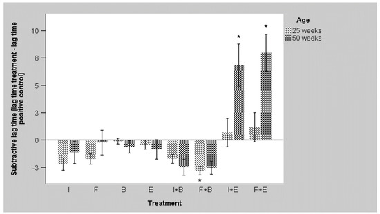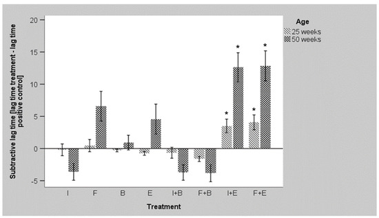 Comparison of different treatments and ages regarding the lag time [h] of S. Enteritidis (I = Inulin, F = FOS, E = Enterococcus faecium, B = Bacillus coagulans, + = combination; mean values, n = 15 for each age, all farms included, error bars indicate the SEM, significant differences compared to positive control are indicated by asterisks).