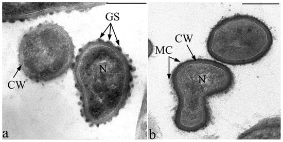 Transmission electron microscopy. Ultrathin sections of the strain F2E cells (a) and cells of the most phylogenetically close type strain of M. lacticum VKM Ac-1145 (b), fixed in the presence of ruthenium red. Electron-dense globular structures (GS) on the surface of the cell wall of strain F2E (a) are indicated. Designations: GS—globular structure; CW—cell wall, MC—microcapsule, N—nucleoid. Bar—200 nm.