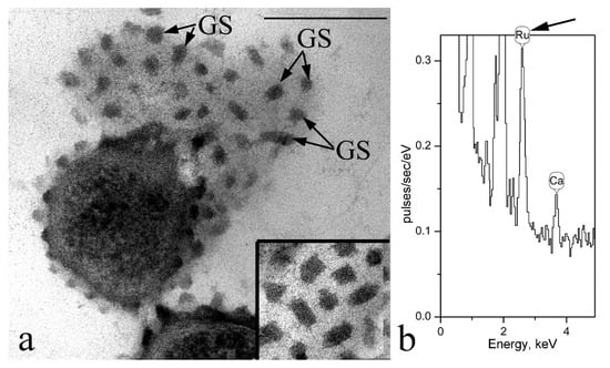 Ultrathin sections of cells of the strain F2E (a) Electron-dense globular structures (GS) on the surface of the cell wall of strain F2E are indicated. (b) X-ray spectrum obtained from electron-dense GS on a tangential (surface, oblique) slice (a slice fragment in the lower right corner of Figure 3a). The arrow indicates the peak of ruthenium. Designations: GS—globular structure. Bar—200 nm.