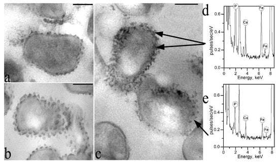 Analysis of unstained ultrathin sections showed that in all investigated variants of incubation of the strain F2E in media containing compounds of copper, nickel, mineral and organic forms of iron, GS are clearly identified as electron-dense granules of characteristic shape and size. This suggests that all the studied elements bind to GS, as a result of which their electron density increases (Figure 4a–c). However, only in the case of incubation of the of the strain F2E cells in a solution with a mineral form of iron, the iron element was reliably detected by X-ray microanalysis in GS (Figure 4d,e). This is probably due to insufficient sensitivity of the device.
