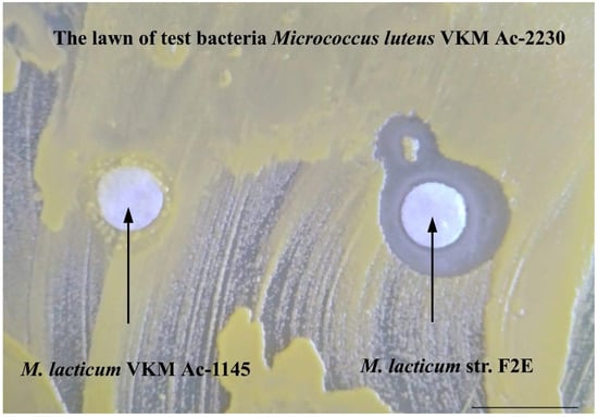 Experiments were also carried out with the identification of antibacterial activity against test bacteria in the typical strain of M. lacticum VKM Ac-1145, which is phylogenetically closest to the strain F2E, but does not have GS on the cell wall surface. In experiments with this strain, the formation of lysis zones or growth inhibition of test bacteria cells was not observed.