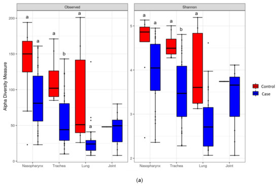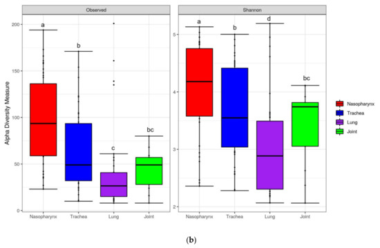 (a) Comparative alpha-diversity (observed and Shannon) of OTUs in respiratory tract and joint microbiota from case and control cattle. Different lowercase letters associated with each sample type differ at p < 0.05. (b) Comparative alpha-diversity (observed and Shannon) of OTUs in respiratory tract and joint microbiota from BRD mortalities (cases). Different lowercase letters differ at p < 0.05.
