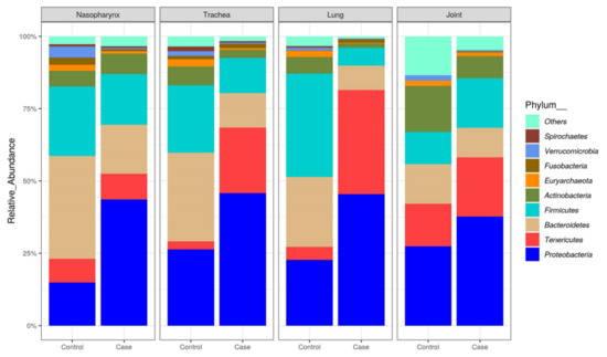 Twenty-nine different bacterial phyla were observed among all samples, but only Proteobacteria, Tenericutes, Bacteroidetes, Firmicutes, Actinobacteria, Fusobacteria and Euryarchaeota had a relative abundance greater than 1.0% (Figure 2). Five phyla represented 94.1% of the total bacterial community in both cases and controls: Proteobacteria (39.4%), Tenericutes (17.3%) Bacteroidetes (17.2%), Firmicutes (15.6%) and Actinobacteria (4.6%). The relative abundance of these phyla differed between cases and controls depending on the type of tissues. A predominance of Proteobacteria was noted in the nasopharynx (43.6%), trachea (45.8%), lung (45.4%) and joint (37.7%) of cases as compared to samples from controls, 14.9%, 26.3%, 22.7% and 27.4%, respectively. Tenericutes, of which Mycoplasma is a genus, were prevalent in all tissue types (Figure 2), comprising 20.5% of bacteria in joints as compared to 8.9% in nasopharynx, 22.7% in trachea and 36.0% in lungs.