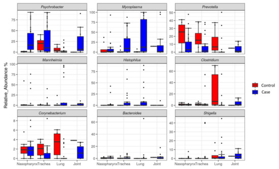 Both Mycoplasma and Psychrobacter were the predominant genera in samples, with a relative abundance of 17.1% and 19.9%, respectively, followed by Prevotella 1 (9.2%), Mannheimia (8.8%), Histophilus (4.0%), Clostridium (3.0%), Corynebacterium (1.36%), Bacteroides (1.3%) and Shigella (0.9%) in both cases and controls (Figure 3). Compared to controls, the relative abundance of Mycoplasma and Psychrobacter increased, while Prevotella decreased in all sample types associated with cases (Figure 3). Bacterial genera associated with cases also differed among sample types (Figure 3). For example, Mycoplasma was more abundant in joint, lung, trachea and nasopharynx at 20.5%, 36.0%, 22.4% and 8.8%, respectively. The relative abundance of both Mannheimia and Histophilus was 2.0 and 0.9% in joints as compared to the nasopharynx (5.7 and 2.6%), trachea (2.5 and 7.7%) and lung (21.8 and 10.4%). In addition, the relative abundance of Prevotella in joints was 4.1% as compared to nasopharynx (8.6%), trachea (6.2%) and lungs (3.6%). The relative abundance of Shigella associated with joints was 3.2% as compared to nasopharynx (0.5%), trachea (2.7%) and lungs (3.8%).