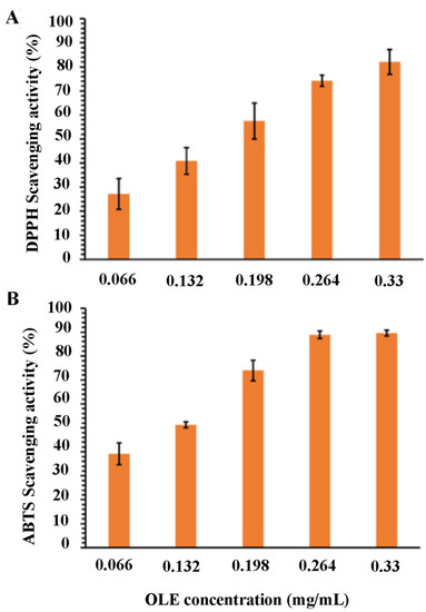 Antioxidant activity of OLE against DPPH• (A) and ABTS• (B) expressed as percentage of radical scavenging activity versus extract concentration. The results represent the mean ± SD of three independent experiments.