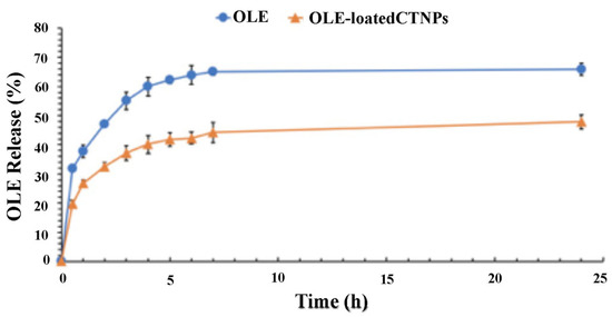 As shown in Figure 3, the OLE release was slowed down by its encapsulation in CTNPs. In this way, a low release was recorded after 24 h both for free OLE and OLE-loaded CTNPs equal to 65.82% and 47.82%, respectively. Potentially, this behavior could be related to the low solubility of OLE lipophilic molecules in PBS that led to a slow diffusion. These results are in good agreement with a previous study, where a similar release trend was observed [30].