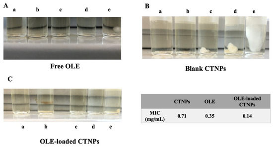 Minimal inhibition concentration (MIC) of OLE when free (A) and loaded in CTNPs (B); MIC of blank CTNPs was also evaluated at the same dilutions (C); a: 1.41 mg/mL; b: 0.71 mg/mL; c: 0.355 mg/mL; d: 0.142 mg/mL; e: 0.071 mg/mL.