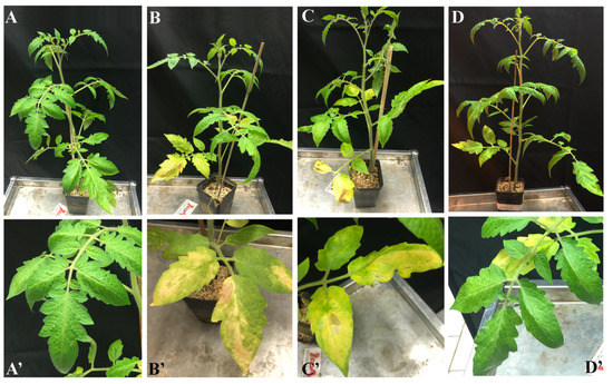 Tomato plants inoculated with V. dahliae for 10 days ((B,B’) Positive CTR) and treated with OLE-loaded CTNPs for 7 days at (C,C’): 0.71 mg/mL, (D,D’): 1.41 mg/mL, (A,A’) non-inoculated tomato plants (negative CTR).