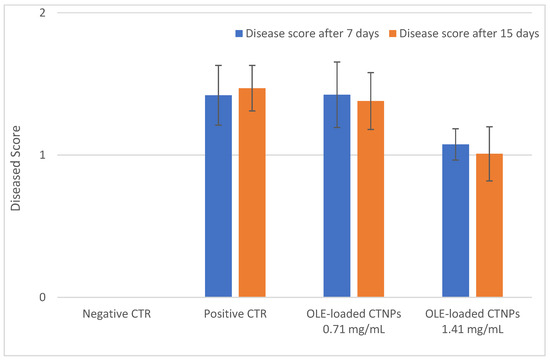Plants inoculated with V. dahliae (Figure 6B) for 10 days showed severe chlorotic mottling on individual leaves, followed by wilt and leaf drop with a disease score equal to 1.42 ± 0.50. No significant symptoms of recovery were observed after the treatment with OLE-loaded CTNPs at a concentration of 0.71 mg/mL for 7 days, with a disease score equal to 1.42 ± 0.32 (Figure 6C). In contrast, tomato plants infected with V. dahliae, and treated with OLE-loaded CTNPs at a concentration of 1.41 mg/mL for 7 days, showed an incidence of the disease as significantly reduced (p < 0.05), with a score of 1.08 ± 0.19 (Figure 6D).