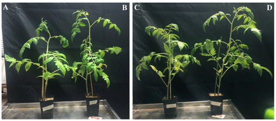 In vivo effect of OLE-loaded CTNPs on the growth state of tomato plants. (A) Plants inoculated with V. dahliae for 10 days (positive CTR); (B) non-inoculated plants (negative CTR). Plants inoculated with V. dahliae for 10 days and treated with OLE-loaded CTNPs; (C) at a concentration of 0.71 mg/mL and (D) at a concentration of 1.41 mg/mL.