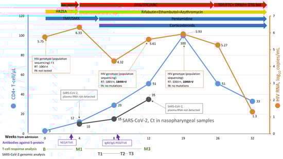 Timeline—RAL, raltegravir; TDF, tenofovir disoproxil fumarate; DTG, dolutegravir; ABC, abacavir; 3TC, lamivudine; FTC, emtricitabine; DRV/r, darunavir/ritonavir; bid, twice a day; TMP/SMX, trimethoprim/sulfamethoxazole; RT, reverse transcriptase; IN, integrase; HRZEA, isoniazid, rifampin, pyrazinamide, ethambutol, azithromycin; Ct, cycle threshold of severe acute respiratory syndrome coronavirus 2 (SARS-CoV-2) in nasopharyngeal samples. Time points of T-cell response analysis: B, Baseline; M1, Month 1; M3, Month 3. Time points of SARS-CoV-2 genomic analysis from nasopharyngeal samples: T1, time point 1; T2, time point 2; T3, time point 3. Time points represent estimations through the timeline.