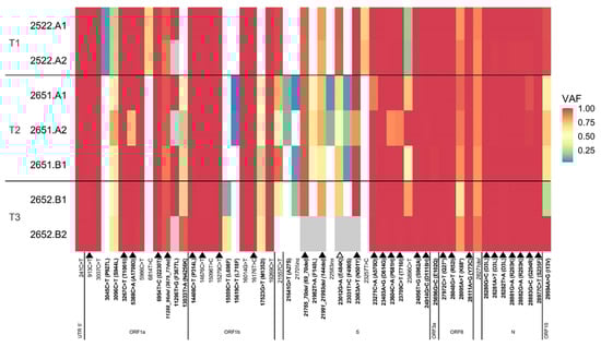 At the T1, we observed 46 mutations (four of them deletions), defined as positions with a nucleotide difference against the reference genome SARS-CoV-2 Wuhan-Hu-1 (MN908947.3), and shared by at least two replicates of the same time point (Figure 2). Thirty-six of these mutations had a VAF ≥ 0.95, suggesting they were fixed in the viral population. Except for small, most likely technical VAF fluctuations in some of the replicates, all the fixed mutations maintained a high VAF along the three time points sampled (T1-T3). The remaining 10 mutations observed at T1 had a VAF < 0.95, suggesting that they might represent intra-host mutations that were segregating in the viral population. Several of these mutations also fluctuated in VAF throughout time, but it was unclear whether changes in VAF were always reliable, due to the low coverage at some positions in some replicates. Thus, six apparently intra-host mutations were maintained at a high VAF across the three time points: 3675_3677del, 69_70del, 144del, 28095A > T (K68*), 28271del and 29594A > G (I13V), suggesting they were probably fixed, invariable mutations. Three of the intra-host mutations inferred at T1 were not detected at T2 or T3: 3045C > T (P927L), 6814T > C and 23257T > C. Of note, 3045C > T (P927L) was already at a very low VAF (0.07) in T1. Interestingly, 23012G > A (S:E484K) was already technically fixed (VAF > 0.95) at the first time point, but its frequency decreased at T2 and T3 going down to 0.49–0.72. Some intra-host mutations not detected in T1 appeared in T2 or T3: 13033T > A (ORF1a:N4256K), 15559C > T (ORF1b:L698F), 15619C > T (ORF1b:L718F), 17523G > T (ORF1b:M1352I), 21641G > T (S:A27S), 21701ins, 21982T > A (F140L), 22583ins, 23031T > C (F490S). These mutations were often detected at low VAFs, and did not reach fixation, except for 13033T > A (ORF1a:N4256K) and 23896C > T which increased through time up to very high VAFs. Most of these intra-host mutations do not seem to be very frequent worldwide (see https://outbreak.info, accessed on 19 October 2021). Only 3096C > T (ORF1a:S944L) is a bit more common, but still appears in a small number of cases (<0.5%). More than half of the intra-host mutations were located outside the spike protein and none of them corresponded with known mutations considered potentially advantageous to viral replicative capacity (see mutation list at http://covid19.datamonkey.org, accessed on 19 October 2021).