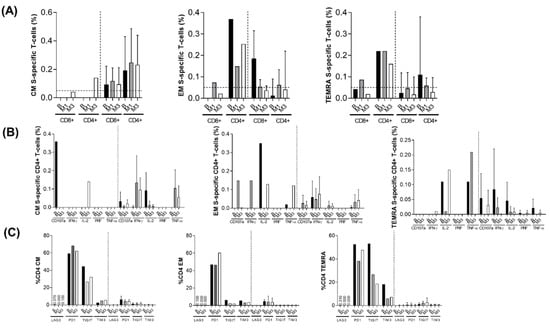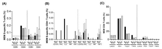 Peripheral blood mononuclear cells (PBMCs) were thawed, washed and rested for 1 h in DNase I (Roche Diagnostics, Indianapolis, IN, USA)-containing R-10 complete medium (RPMI 1640 supplemented with 10% heat-inactivated fetal bovine serum, 100 U/mL penicillin G, 100 l/mL streptomycin sulfate, and 1.7 mM L-glutamine). 1.5 × 106 PBMCs were stimulated in vitro for 6 h with overlapping protein S (PepMix™ SARS-CoV-2; Spike Glycoprotein, from JPT, Berlin, Germany). 1.5 × 106 PBMCs incubated with the proportional amount of DMSO were included in each batch of experiments as a negative control. The stimulation was performed in the presence of 10 µg/mL of brefeldin A (Sigma Chemical Co, St. Louis, MO, USA), and 0.7 µg/mL of monensin (BD Biosciences), anti-CD107a-BV650 (clone H4A3; BD Biosciences, USA) monoclonal antibody and unconjugated CD28 and CD49d as previously described []. T-cell specific response was defined as the frequency of cells with detectable intracellular cytokine production, after background subtraction of the unstimulated condition. For this analysis 1 × 106 events were acquired and a median of 4.72 × 105 live T-cells were gated.