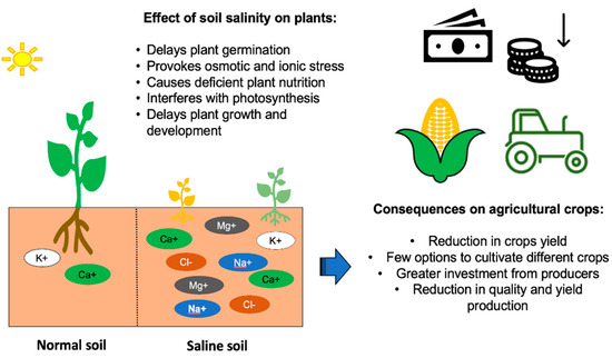 In contrast, several authors have indicated that salinity is one of the main types of abiotic stress that negatively affects plant growth and development, ultimately leading to a reduction in crop production [23,24,32,36,37]. According to Afridi et al. [36] approximately 800 million hectares of arable land around the world are affected by salinity, mainly in arid and semi-arid regions. This abiotic stress is analyzed in greater detail, as follows: