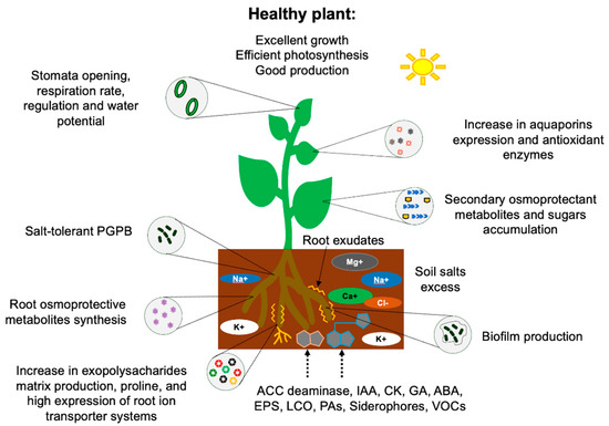 Under saline stress conditions, PGPB produce extracellular molecules that positively impact plant development, defensive functions, growth stimulation through the induction of defense against pathogens, and stress tolerance [126]. Of these molecules, the most studied are exopolysaccharides (EPS), which stabilize the structure of the soil and increase water availability and ion exchange. In addition, they are important in biofilm formation, which confers resistance to bacteria against adverse environmental conditions [141].