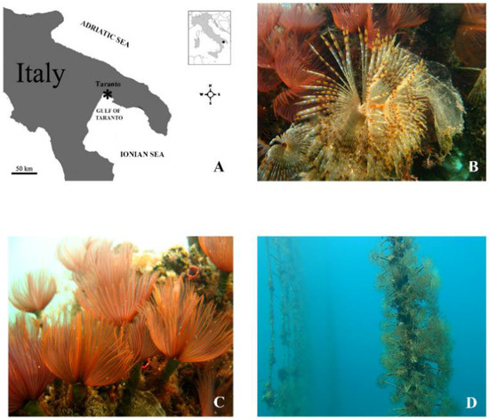 (A) Map of the sampling site in the Gulf of Taranto (Mediterranean Sea, Ionian Sea, Italy). (B) Specimen of the polychaete Sabella spallanzanii. (C) Specimens of the polychaete Branchiomma luctuosum. (D) Rearing trials of the polychaetes in the integrated multitrophic aquaculture (IMTA) system realized in the Gulf of Taranto. Polychaetes were arranged in polypropylene nets, which were hung vertically within a typical long-line system.