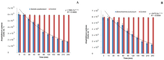 Changes in Amphidinium carterae abundances measured in the control and treatment beakers with (A) Sabella spallanzanii and (B) Branchiomma luctuosum.