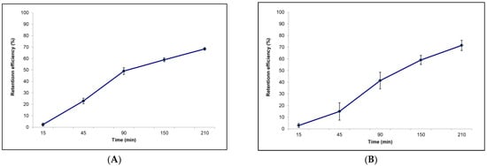 Retention efficiency calculated within each sampling time for (A) Sabella spallanzanii and (B) Branchiomma luctuosum.