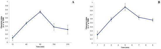 The clearance rate values measured for S. spallanzanii within each sampling time are shown in Figure 4A. At T 90, the highest C value was recorded for this species (C = 0.75 L h−1 g−1 DW), while the lowest value was measured at T 15 (C = 0.11 L h−1 g−1 DW). The C values significantly differed among sampling times (p < 0.001). The Cmax, calculated as the mean value of all the single maximal values recorded for each individual, was 0.936 ± 0.151 L h−1 g−1 DW.