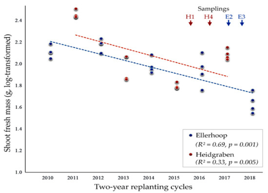 Replanting apple in the same plots resulted in progressive growth reduction in both fields, Ellerhoop and Heidgraben (Figure 1). In Ellerhoop, plant growth was generally poor in the first period ending in the year 2010, probably due to unfavorable weather conditions. However, shoot fresh mass was significantly reduced when considering the following periods of replanting. An exponential decline in shoot weight was observed. In Heidgraben, plant growth was drastically decreased in the first replanting period 2011–2013 and decreased further in the second period 2013–2015.