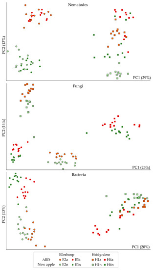 Principal component analyses of nematode communities and co-extracted fungal and bacterial microbiomes from replanted plots with apple replant disease (ARD, red/orange symbols) or control plots that were planted with apple for the first time after grass cover (new apple, green symbols). The field experiment of Ellerhoop was sampled in November 2017 (E2) and April 2018 (E3), the field experiment of Heidgraben was sampled in April 2016 (H1) and April 2017 (H4). The first two principal components (PC1, PC2, % explained variance in brackets) of log-transformed relative abundances of OTU from high-throughput amplicon sequencing data of ribosomal markers are shown.