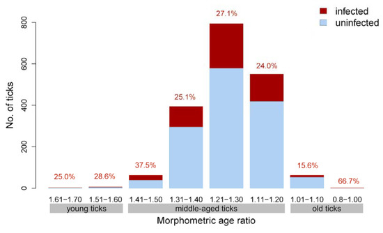 Distribution of the morphometric age ratio and Borrelia prevalence in the dataset of 1882 I. ricinus ticks. Percentages indicate the Borrelia prevalence in each category.