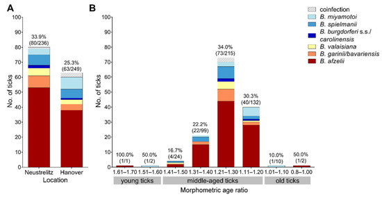 Borrelia spp. composition as determined by RLB among the 142 successfully differentiated samples according to (A) sampling location and (B) tick morphometric age ratio. Percentages above the bars indicate RLB differentiation success in each category. Coinfections consisted of B. garinii/bavariensis + B. valaisiana (1× in Neustrelitz, and 1× in Hanover), B. afzelii + B. valaisiana (1× in Hanover), and B. afzelii + B. miyamotoi (1× in Hanover).