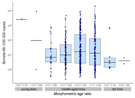 Borrelia 5S–23S IGS copies in the different morphometric age groups. Boxplots are shown for groups with n ≥ 5, while individual data points are shown in dark blue. The thick line indicates the median.