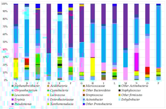 The main phyla were Methanobrevibacter, Acidobacteria, Actinobacteria, Bacteroidetes, Firmicutes, and Proteobacteria, that were present in all the samples, in accordance with prior investigations on the bacterial biodiversity of Alpine milk collected from a single Malga located in Trentino [37]. Proteobacteria was the dominant phylum in all the samples, in agreement with the findings reported for other traditional butters [36] or butter obtained by cream ripened at 4 °C [14] that, analyzed by NGST, were most populated by Proteobacteria and contained low amounts of Firmicutes. Firmicutes is the dominant phylum in traditional dairy products [2]; conversely, in TMB, the Firmicutes was always lower than 13%. We observed only two Mfarms (A and H) producing TMB with a higher relative abundance of Firmicutes (24.9% and 23.8%, respectively). Reads belonging to Cyanobacteria phylum likely come from the amplification and sequencing of plant chloroplasts that originated from Cyanobacteria [38]. The main taxa detected in TMB that alone described more than 85% of the total bacterial population were as follows (Figure 1): Chriseobacterium (an average relative abundance of 4.7%), Lactococcus (5.5%), Enterobacteriaceae (13.7%), Acinetobacter (35.4%), and Pseudomonas (27.9%). These bacterial taxa are consistent with previous data on raw cow milk cream samples from spontaneous creaming collected in the same area [39]. Pseudomonas and Acinetobacter, as psychrotrophic microorganisms, grow well even at 4 °C [40,41] and are commonly present as dominant Gram-negative bacteria in dairy milk [37,39,42]. Conversely to Pseudomonas and Acinetobacter, the relative abundance of Lactococcus in TMB samples was much lower, probably because refrigeration had an effect on the Lactococcus growth [42]. Unlike the majority of the samples, Lactococcus showed a high relative abundance in TMB from Mfarms A and H (relative abundances were always higher than 20%); we speculated that this could be an effect of the milk pre-maturation before skimming that allowed an overgrowth of Streptococcaceae bacteria. In fact, the Mfarms in which the milk pre-maturation was performed before skimming (A, H, and O, Table S1) showed a total abundance of Streptococcaceae (Lactococcus and Streptococcus species) higher than the other Mfarms. The total Lactococcus and Streptococcus relative abundances were 22.89%, 23.09%, and 13.11% in Mfarms A, H, and O, respectively (Table S2); conversely, in the other Mfarms, in which the TMB was produced without milk pre-maturation, the total relative abundance of the Lactococcus and Streptococcus species was never higher than 5.91% (with only the exception of Mfarm B, with a relative abundance of Lactococcus and Streptococcus species of 10.36%).