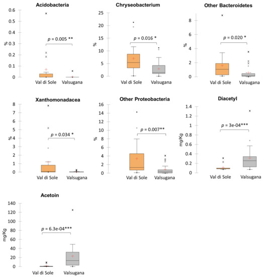 Box plot of the relative abundances (%) of Acidobacteria, Chryseobacterium, other Bacteroidetes, Xanthomonadaceae, other Proteobacteria, and the concentration of diacetyl/acetoin measured in the TMB of the two valleys in Trentino (Val di Sole, n = 17; Valsugana n = 25). Significance level: * p ≤ 0.05 significant; ** p ≤ 0.01 very significant; *** p ≤ 0.001 highly significant.
