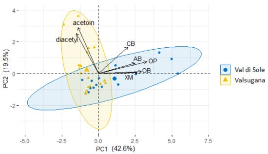 The main variables contributing to the PC1 dimension were the relative abundances of Acidobacteria, Chryseobacterium, other Bacteroidetes, Xanthomonadaceae, and other Proteobacteria; conversely, the main variables contributing to the PC2 dimension were the concentration of diacetyl and acetoin. The PCA analysis did not allow for the clustering of the TMB samples according the two geographical locations, Val di Sole and Valsugana, in agreement with the beta diversity analysis of the Illumina data, confirming that the geographical location did not affect the microbial differences among the Mfarms.
