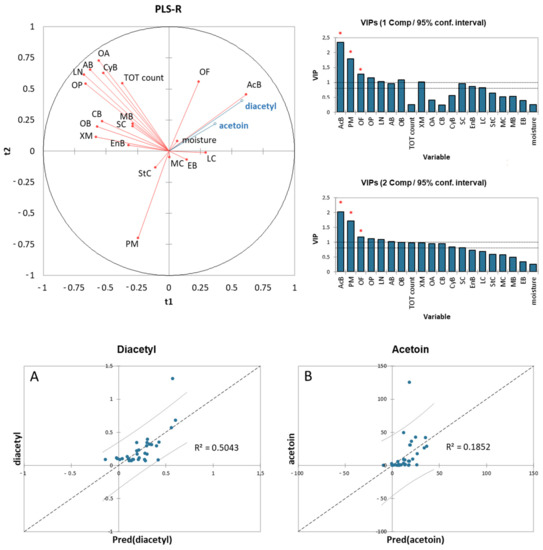 The correlation between the diacetyl/acetoin concentration and the Illumina data, TBC, and moisture of the TMB samples was performed using a partial least squares regression (PLSR) cross-validation procedure, in order to build a predictive model. The results of the PLSR analysis are presented in Figure 4.