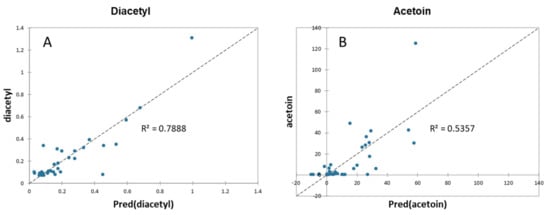 The entire dataset was used as a calibration model, but the variables with the highest importance in prediction scores (VIP: red asterisks in Figure 4) were the relative abundances of Acinetobacter, Pseudomonas, and other Firmicutes. The PLS predictive models for the content of diacetyl and acetoin in the TMB samples, considering the VIPs as variables for the quantitative analysis of variation, provided the determination coefficients of 0.5043 and 0.1842 for diacetyl and acetoin, respectively.