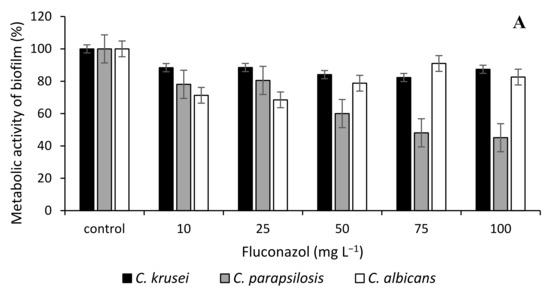 The minimum inhibitory concentration of biofilm (MBIC50) was determined by MTT assay (Table 2), as the metabolic activity of cells of selected Candida strains was monitored at the same time. We did not observe any significant effect of fluconazole on the biofilm of the studied yeasts. At antifungal concentration of 100 mg L−1, the metabolic activity of the cells decreased only slightly (with the exception of Candida parapsilosis strain CCM 8260, in which the metabolic activity decreased by 50%). Maiolo et al. [72] have shown that concentrations higher than 1000 mg L−1 should be used to inhibit biofilm formation (MBIC).