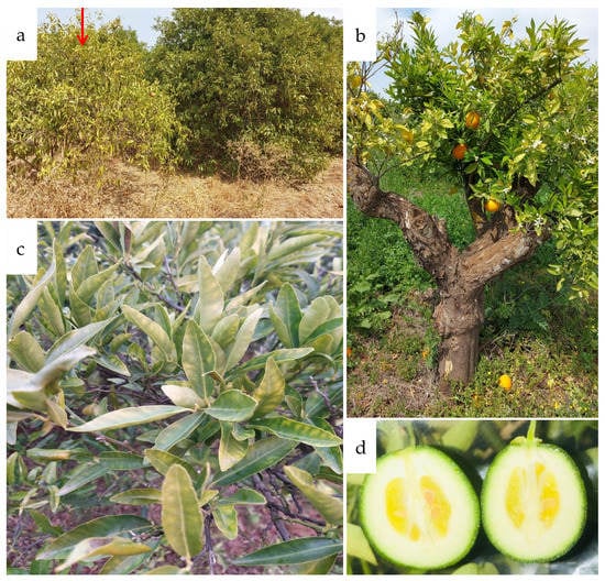 Field symptoms of citrus stubborn disease observed in Moroccan citrus orchards in the Tadla region (situated in the center of Morocco) in growing season 2021. (a) Compressed and stunted Navel sweet orange tree (red arrow); (b) clementine tree with different phenological stages; (c) Navel sweet orange leaves showing nutritional deficiency-like symptoms; (d) Navel sweet orange fruits with a gland shape.