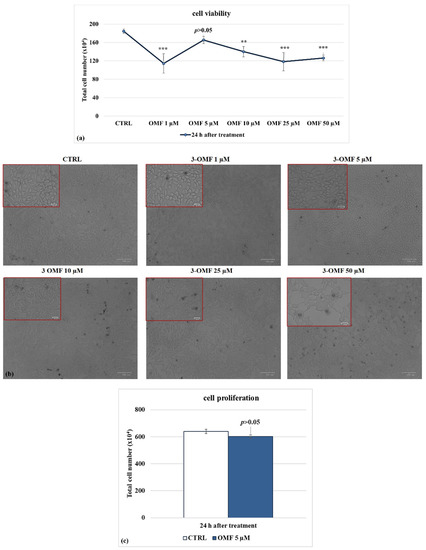 To explore the effect of OMF on MDBK cells’ proliferation, we analyzed the mitochondrial redox ability by MTT assay. At 24 h p.i., OMF at 5 μM did not provoke significant (p > 0.05) time-dependent alteration in the amount of mitochondrial dehydrogenases activity compared to control cells (Figure 2c). In brief, these experiments showed that OMF at the concentration of 5 μM did not significantly modify MDBK cell viability and cell proliferation as compared to untreated cells.