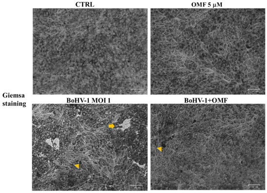 To examine cell morphology, light microscopy following Giemsa staining was used [33]. Briefly, the monolayers of MDBK cells were either infected or not infected with BoHV-1, at an MOI of 1, in the presence or absence of OMF (5 µM), and incubated at 37 °C. After 24 h p.i., Giemsa staining was performed, and a light microscopy examination was carried out under the ZOE Cell Imager (Bio-Rad Laboratories). The cell death features were identified by using the criteria previously described [38,39,40].