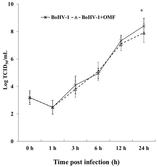 OMF decreases virus yield during BoHV-1 infection in MDBK cells. Cells were infected with BoHV-1 in the presence or absence of OMF. For viral growth curves, MDBK cells were infected with BoHV-1 in the presence or absence of OMF. At indicated times, p.i., virus titer was evaluated by real-time PCR. Significant differences between BoHV-1-infected cells and OMF-treated infected cells are indicated by probability p. * p < 0.05.