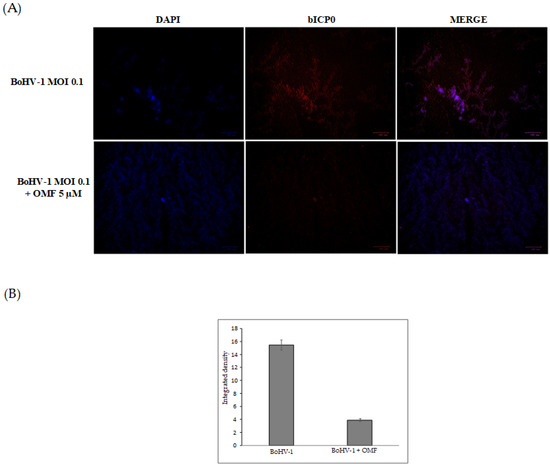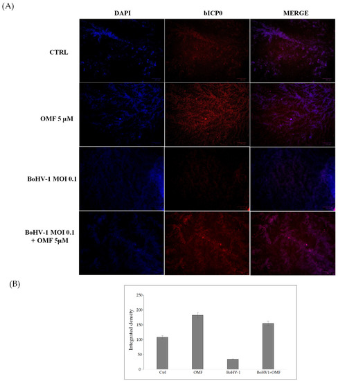 To further clarify the effects of OMF during BoHV-1 infection, we analyzed bICP0 protein expression, the main protein involved in the transcription of BoHV-1 [1,2]. Indeed, bICP0 is expressed during infection in permissive cells, in which it promotes productive infection [3,4,42,43,44]. At 24 h p.i., bICP0 was found in BoHV-1-infected cells (Figure 6), whereas the protein was considerably decreased in the presence of OMF (5 µM) (Figure 6). These results demonstrate that the bICP0 viral protein is generally expressed in BoHV-1-infected cells, and its expression was reduced in infected cells treated with OMF.