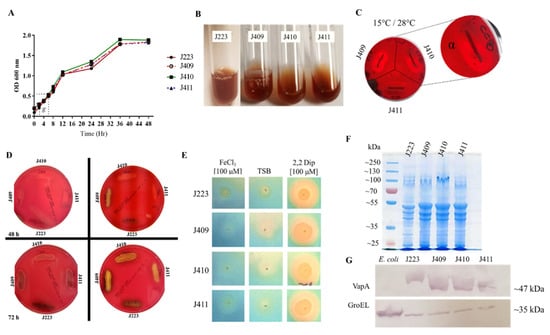 Phenotypic characteristics of atypical and typical A. salmonicida. (A) Growth curve of A. salmonicida J409, J410, and J411 on TSB media at 15 °C; (B) A. salmonicida melanin-brown pigmentation development on the stationary phase; (C) Hemolytic activity evaluated at 15 °C and 28 °C on 5% salmon blood-agar plate for of A. salmonicida J409, J410, and J411. The close-up shows α-hemolysin activity; No differences were observed between plates; (D) Hemolytic activity evaluated in 5% sheep blood agar plate during 48–72 h at 15 °C and 28 °C; (E) Siderophores secretion of A. salmonicida strains grown under iron-rich (100 µM FeCl3), TSB media, and iron-limited (100 µM 2,2 dipyridyl) conditions, evaluated in CAS-MOPs plates at 15 °C; (F) Protein profile evaluated in a 10% SDS-PAGE stained with Coomassie blue; (G) VapA protein identification by Western blot; GroEL protein was used as load control, and E. coli Top10 and A. salmonicida J223 were used as control.