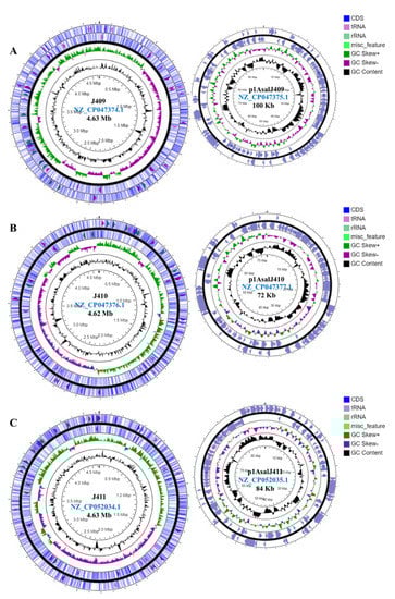 Plasmid profiles for the three atypical strains indicated the presence of a large plasmid in each genome (Figure S1). The chromosome sizes of A. salmonicida J409, J410, and J411 are very similar, 4.63, 4.63, and 4.63 Mb, respectively (Figure 2A–C). The plasmids present in the genome of atypical A. salmonicida strains showed different sizes, ranging between 72 and 100 Kb (Figure 2A–C; Table S4). The G+C content for the three genomes is ~58.6% (Table S5). RAST annotation showed a total of 365, 368, and 366 subsystems (i.e., sets of related functional roles) predicted for J409, J410, and J411 chromosomes, respectively (Table S5).