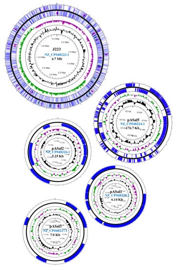 As previously mentioned, all the atypical A. salmonicida strains sequenced in this study harbor one large plasmid (Figure 2A–C; Table S4). In contrast, the highly virulent typical A. salmonicida J223 strain harbors four plasmids—one large (>10 Kb) and three small (<10 Kb) plasmids (Figure 3). The typical A. salmonicida large plasmid pASal5 (177.0 Kb) has a larger molecular weight and coding sequences (CDS) than the atypical large plasmids (p1AsJ409, 100 Kb; p1AsJ410, 72 Kb; p1AsJ411, 84 Kb; Table S4).
