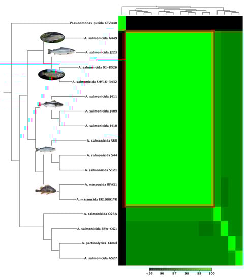 Comparative Aeromonas spp. whole-genome analysis. Heat map analysis visualization based on aligned Aeromonas spp. chromosomes. Images represent the origin of isolation. Color bar represents the percentage of identity within strains. Thirteen A. salmonicida subsp. salmonicida, two A. salmonicida subsp. masoucida RFAS1 and BR19001YR, and A. salmonicida subsp. pectinolytica 34mel were used for the analysis. Pseudomonas putida KT2440 was set up as an outgroup. Analysis was computed using CGWB.