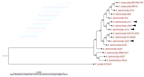 The Prokaryotic Genome Annotation Pipeline (PGAP) showed a total of 4532 genes, 11 (5S), 10 (16S), and 10 (23S) rRNAs, 116 tRNAs, and 4 ncRNAs for A. salmonicida J409 genome; a total of 4546 genes, 11 (5S), 10 (16S), and 10 (23S) rRNAs, 116 tRNAs, and 4 ncRNAs for A. salmonicida J410 genome; and a total of 4586 genes, 11 (5S), 10 (16S), and 10 (23S) rRNAs, 121 tRNAs, and 4 ncRNAs for the A. salmonicida J411 genome (Table 3). Typical A. salmonicida J223 PGAP showed a total of 4626 genes, 10 (5S), 9 (16S), 9 (23S), 116 tRNAs, and 4 ncRNAs (Table 3).