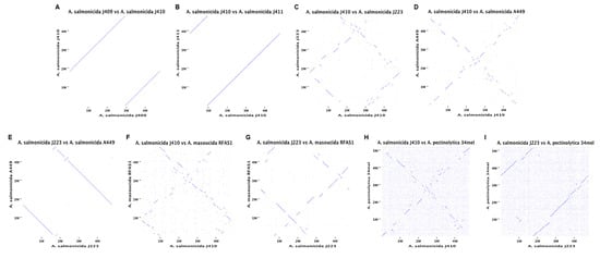 Whole-genome comparison synteny analysis. Genome sequences alignment to identify homology by synteny. (A) Comparison between A. salmonicda J409 vs. J410; (B) Comparison between A. salmonicda J410 vs. J411; (C) A. salmonicida J410 vs. A. salmonicida J223; (D) A. salmonicida J410 vs. A. salmonicida A449; (E) A. salmonicida J223 vs. A. salmonicida A449. (F) A. salmonicida J410 vs. A. masoucida RFAS1; (G) A. salmonicida J223 vs. A. masoucida RFAS1; (H) A. salmonicida J410 vs. A. peptinolytica 34mel; (I) A. salmonicida J223 vs. A. peptinolytica 34mel. Comparative analysis was performed by using CLC Bio.