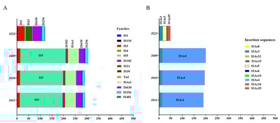 Among the identified IS families in the atypical strains, the identified ISs present in a high copy number are ISAs3 (IS256 family) and ISAs4 (IS5 family) (Figure 8B, Table S8). In contrast, the ISs present in high copy number in the typical strain J223 are ISAs3 (IS256 family), ISAs5 (IS3 family), and ISAs29 (IS21 family) (Figure 8B, Table S8). Clear differences of ISs’ abundances were observed when comparing atypical to typical A. salmonicida. Atypical strains present most of the ISs’ copies in the chromosome, whereas the typical strain presents a higher number of ISs’ copies in the pAsal5 plasmid (Table S8). A similar copy number of the ISAs3 was observed among the four strains. However, two of the major differences are: i) the copy number of the ISAs5 (17 copies) present in typical strain J223 only and ii) the copy number of ISAs4, where 174 copies were identified in the chromosome, and 11, 8, and 4 copies were identified in the p1AsJ409, p1J410, and p1J411 plasmid of atypical strains, respectively. Moreover, the typical strain J233 does not presents copies of ISAs4 (Figure 8B; Table S8).