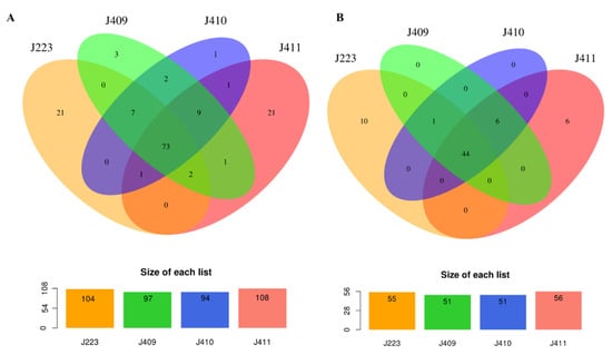Non-coding RNAs (ncRNAs) were identified within the chromosome and plasmids in the typical and atypical strains (File S3). The analysis showed that the typical and atypical strains possess a similar abundance of ncRNAs. The A. salmonicida typical J223 strain harbors 104 ncRNAs copies. A. salmonicida atypical strains J409, J410, and J411 have 97, 94, and 108 ncRNAs copies, respectively (Figure 9A). The cluster analysis showed that 73 ncRNA copies are commonly shared among the four strains. The typical J223 strain possesses 21 unique ncRNAs copies and shares seven ncRNAs copies with J409 and J410, two ncRNAs copies with J409 and J411, and one ncRNA copy with J410 and J411 (Figure 9A). On the other hand, atypical strains J409, J410, and J411 have 3, 1, and 21 non-shared ncRNAs copies, respectively. Only two ncRNAs copies are shared between J409 and J410, nine copies are shared between J410 and J411, and one ncRNAs copy is shared between J409 and J411 (Figure 9A).