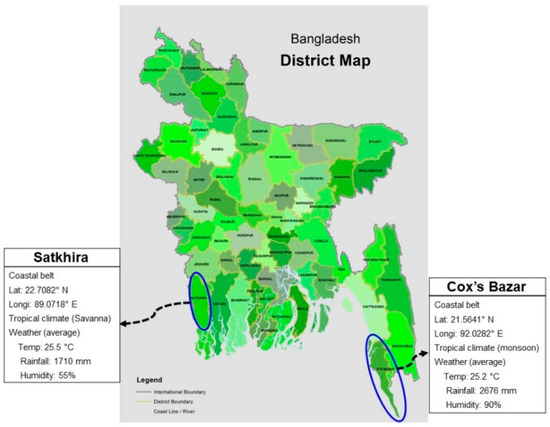South-east and south-west coastal regions of Bangladesh (marked using blue colour) where shrimp ghers are located.